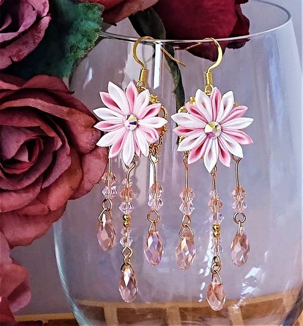つまみ細工の花モチーフにビーズいっぱいピアスです